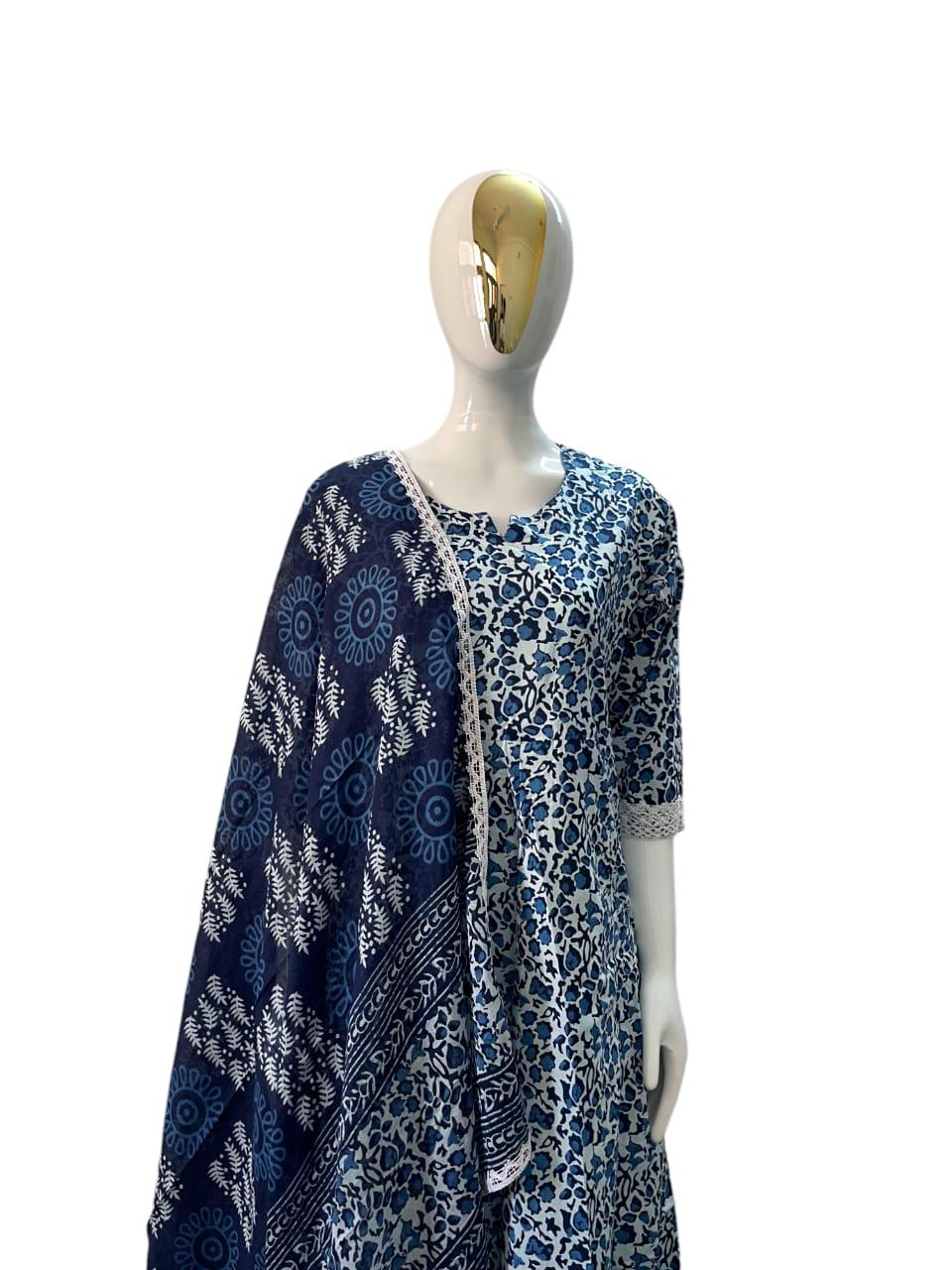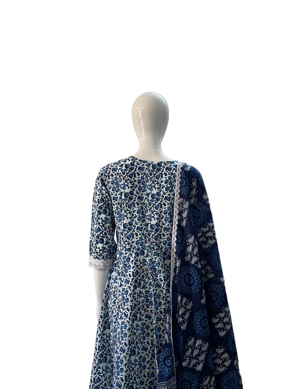 Kurta Fabric: Cotton Bottomwear Fabric: Cotton Fabric: Cotton Sleeve Length: Three-Quarter Sleeves Set Type: Kurta With Dupatta And Bottomwear Bottom Type: Pants Pattern: Printed Net Quantity (N): Single Sizes: XL, L, XXL, M An Anarkali blue printed cotton kurta is a beautiful traditional Indian outfit. Anarkali refers to the style of the kurta, which is characterized by its long, flowing silhouette with a fitted bodice and flared skirt-like bottom. The blue printed cotton fabric adds a touch of elegance and charm to the outfit. This ensemble is perfect for various occasions, from casual gatherings to semi-formal events. You can accessorize it with statement jewelry like earrings, bangles, or a necklace to enhance its beauty further. Pairing it with comfortable footwear like sandals or mojris completes the look, making it both stylish and comfortable to wear. Country of Origin: India