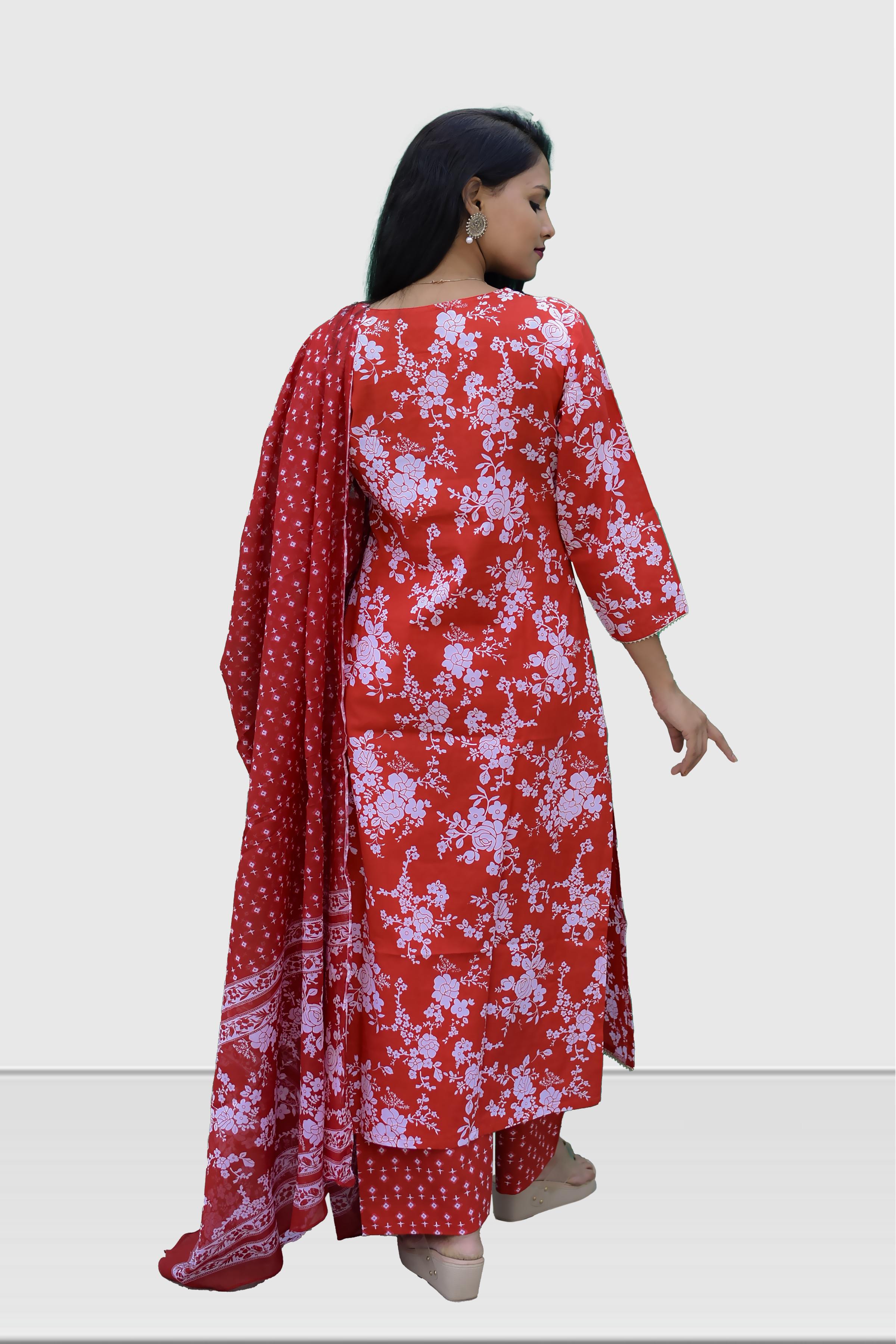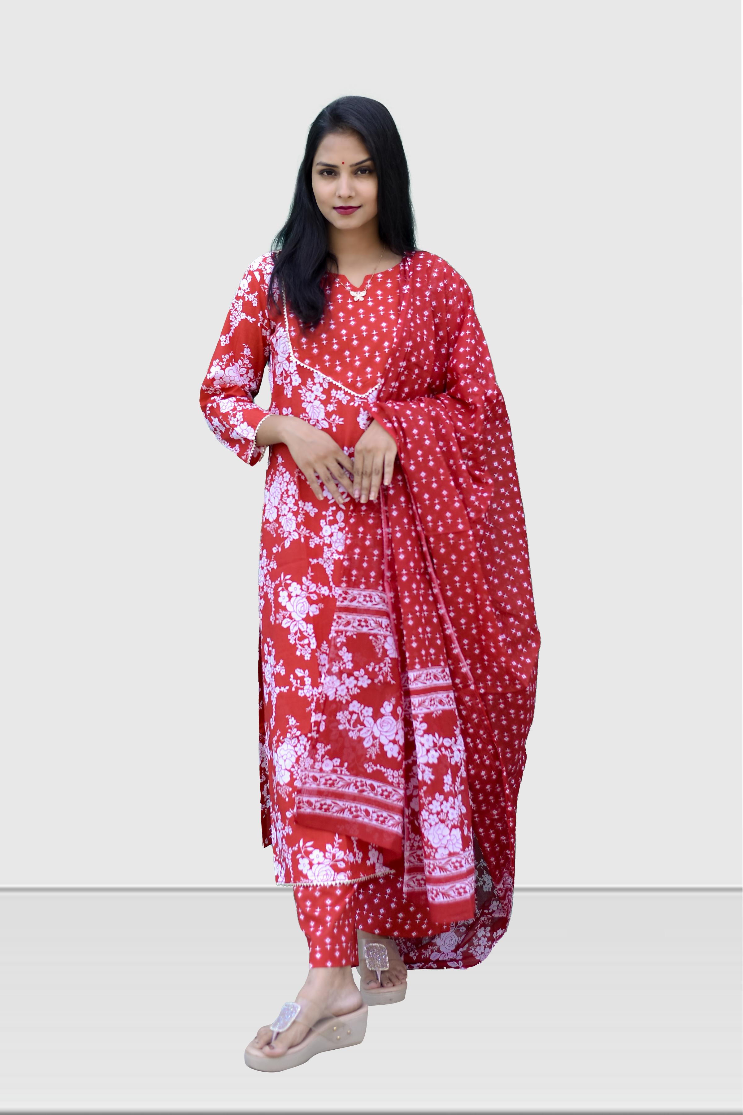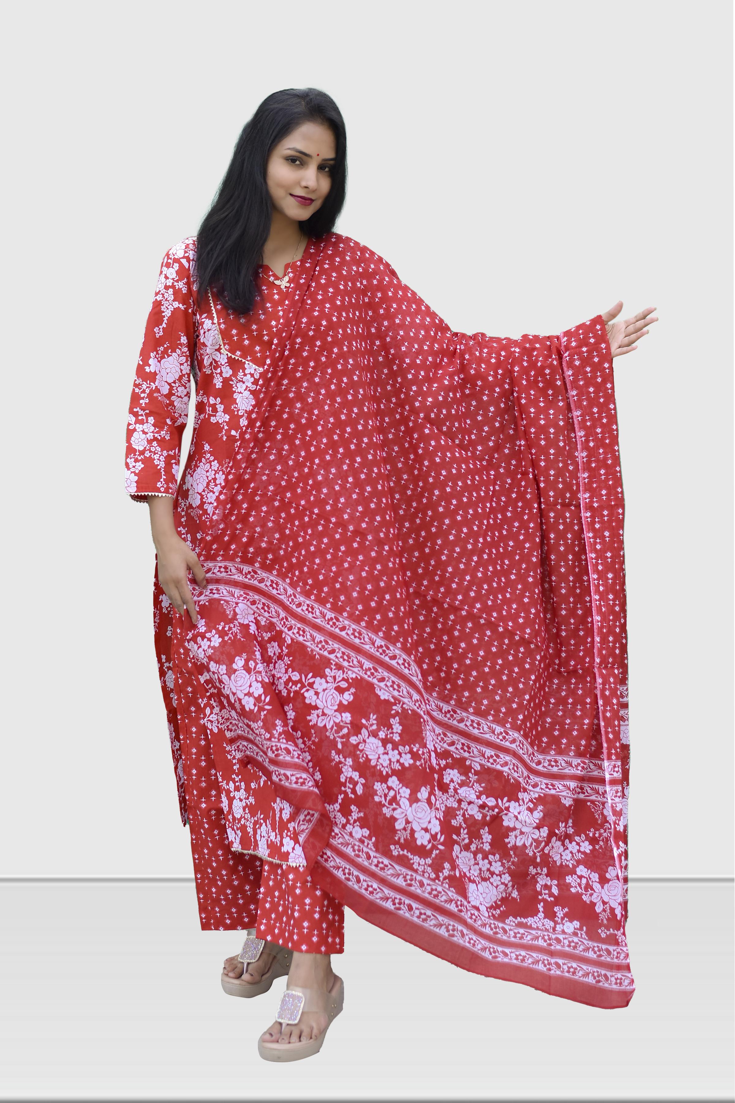 •Color: A Red Printed Cotton Kurta set with a dupatta is a timeless and elegant choice that offers comfort, style, and versatility for various occasions.