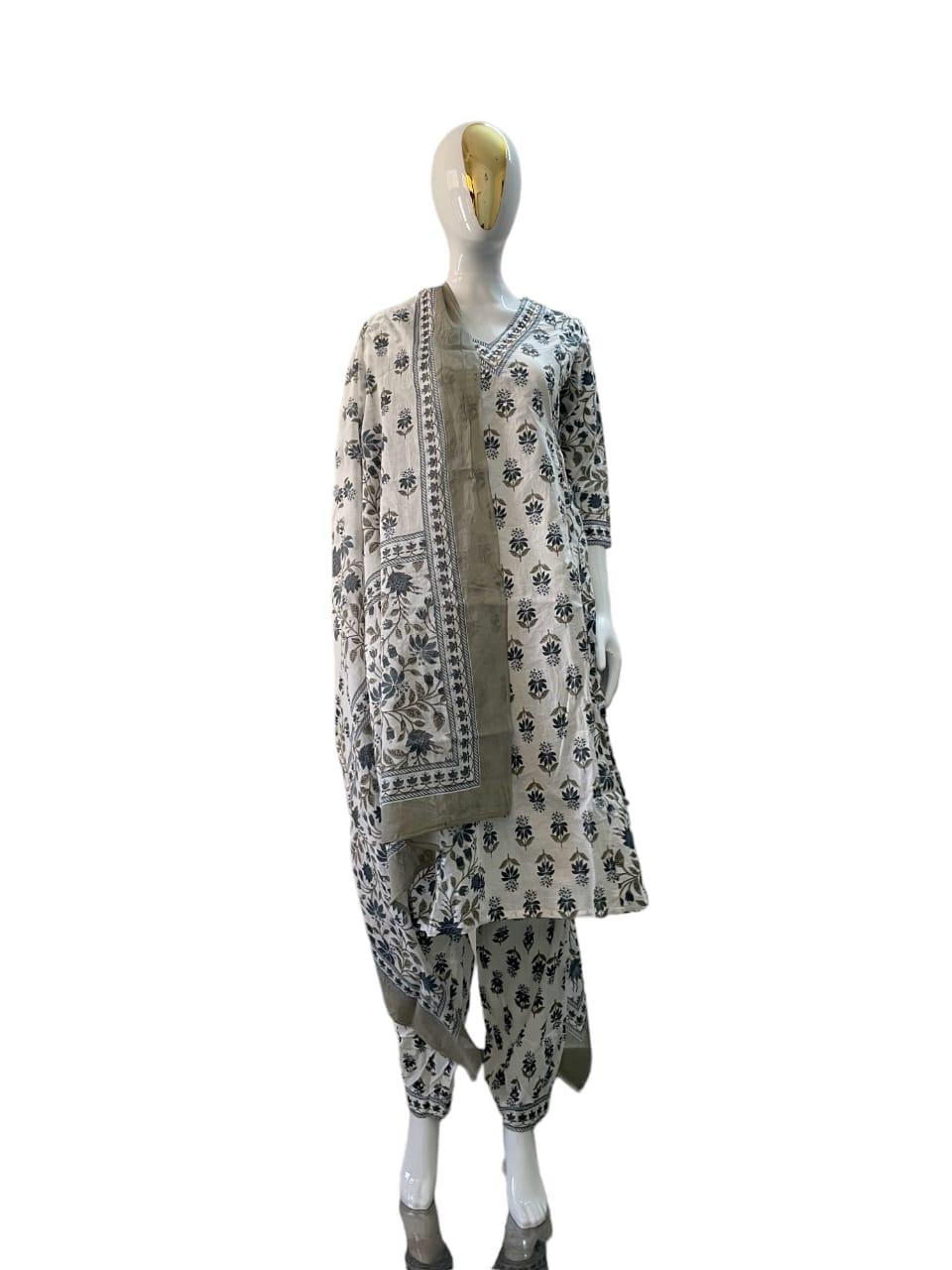 Kurta Fabric: Cotton Bottomwear Fabric: Cotton Fabric: Cotton Sleeve Length: Three-Quarter Sleeves Set Type: Kurta With Dupatta And Bottomwear Bottom Type: Pants