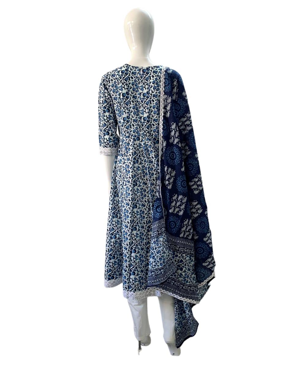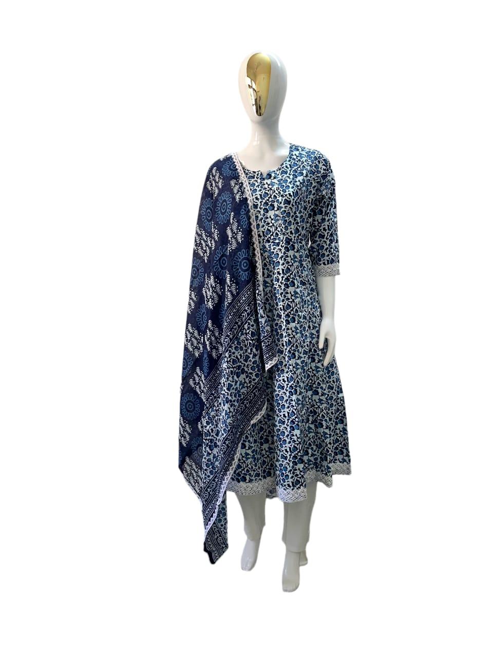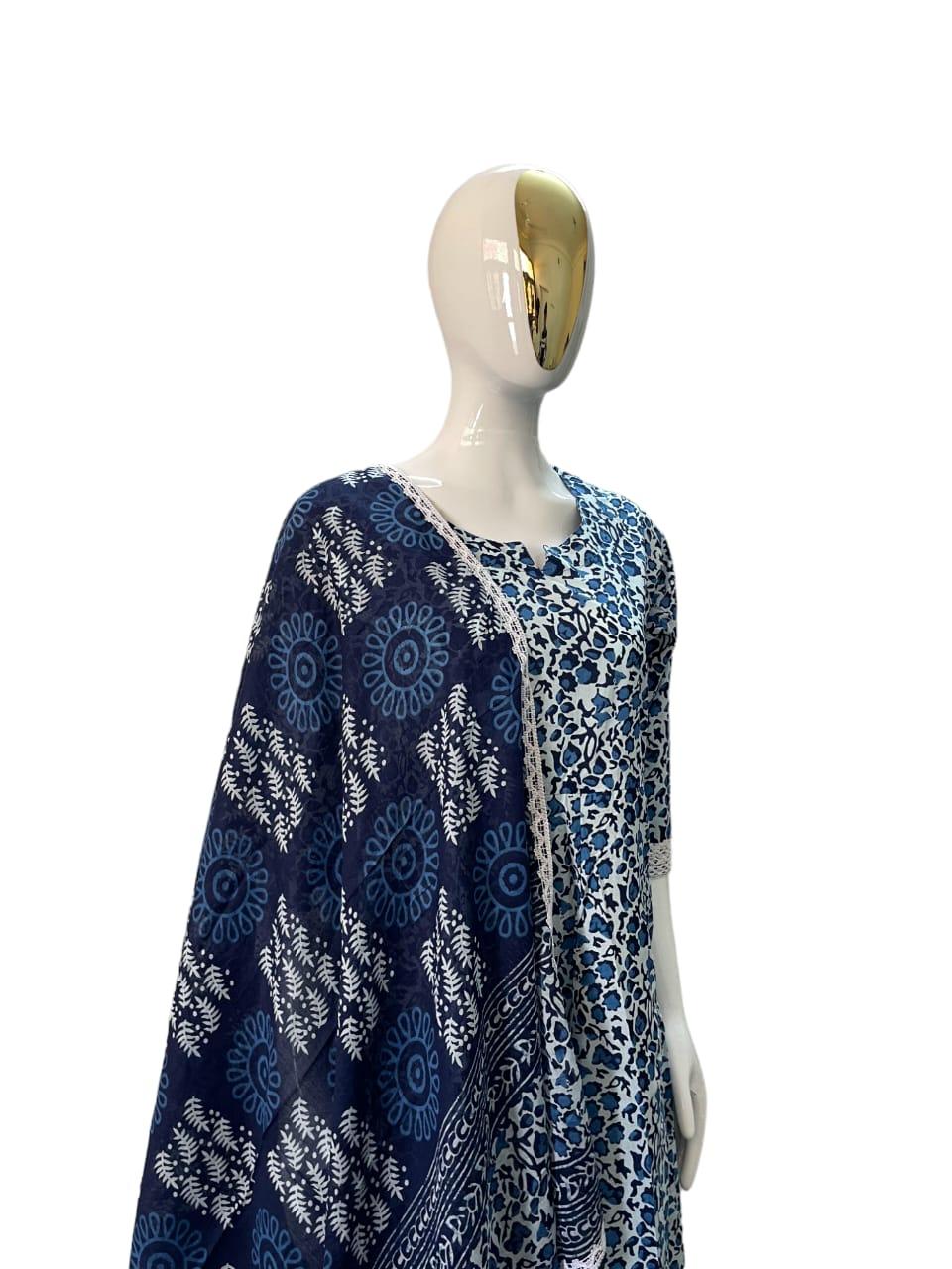 Kurta Fabric: Cotton Bottomwear Fabric: Cotton Fabric: Cotton Sleeve Length: Three-Quarter Sleeves Set Type: Kurta With Dupatta And Bottomwear Bottom Type: Pants Pattern: Printed Net Quantity (N): Single Sizes: XL, L, XXL, M An Anarkali blue printed cotton kurta is a beautiful traditional Indian outfit. Anarkali refers to the style of the kurta, which is characterized by its long, flowing silhouette with a fitted bodice and flared skirt-like bottom. The blue printed cotton fabric adds a touch of elegance and charm to the outfit. This ensemble is perfect for various occasions, from casual gatherings to semi-formal events. You can accessorize it with statement jewelry like earrings, bangles, or a necklace to enhance its beauty further. Pairing it with comfortable footwear like sandals or mojris completes the look, making it both stylish and comfortable to wear. Country of Origin: India