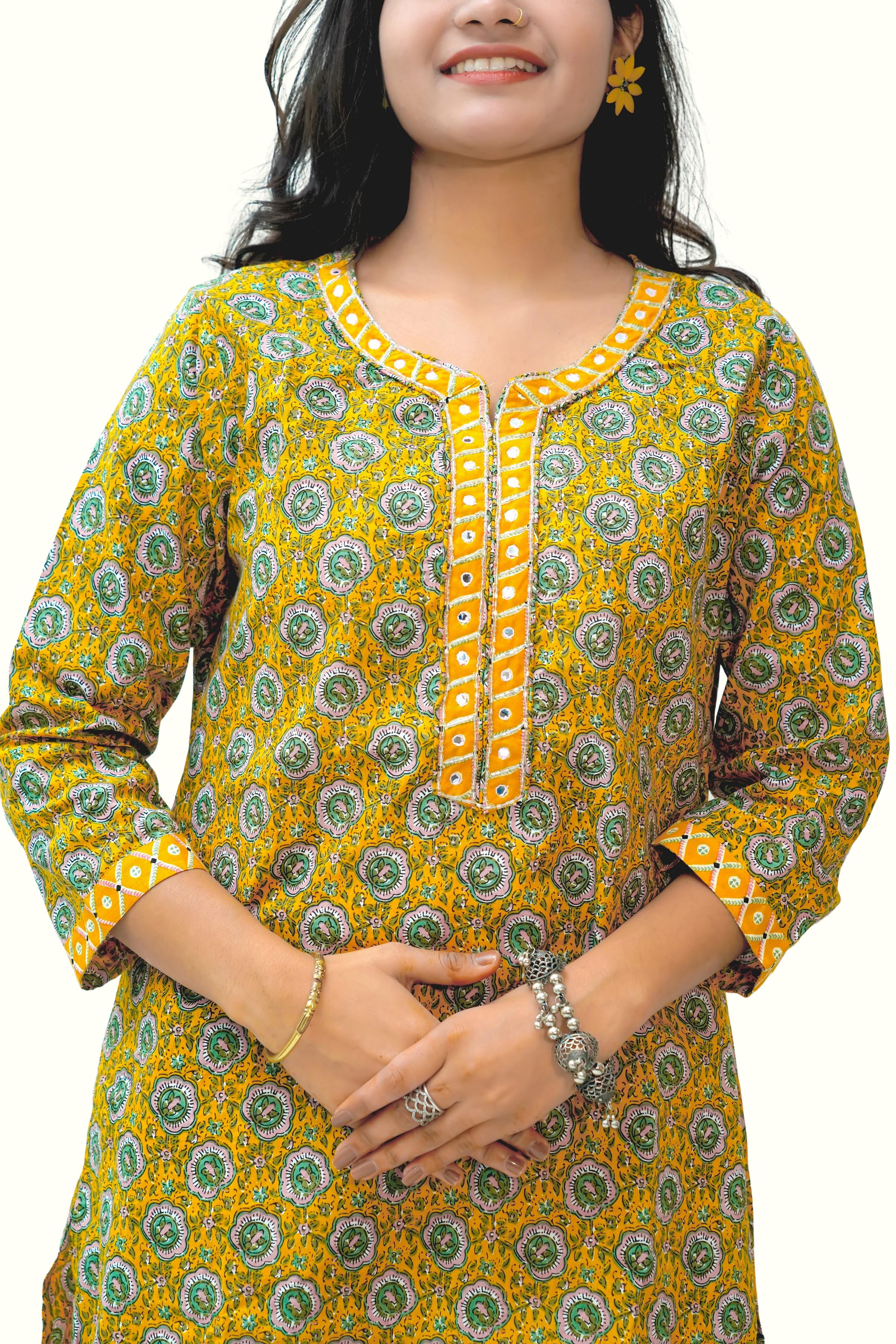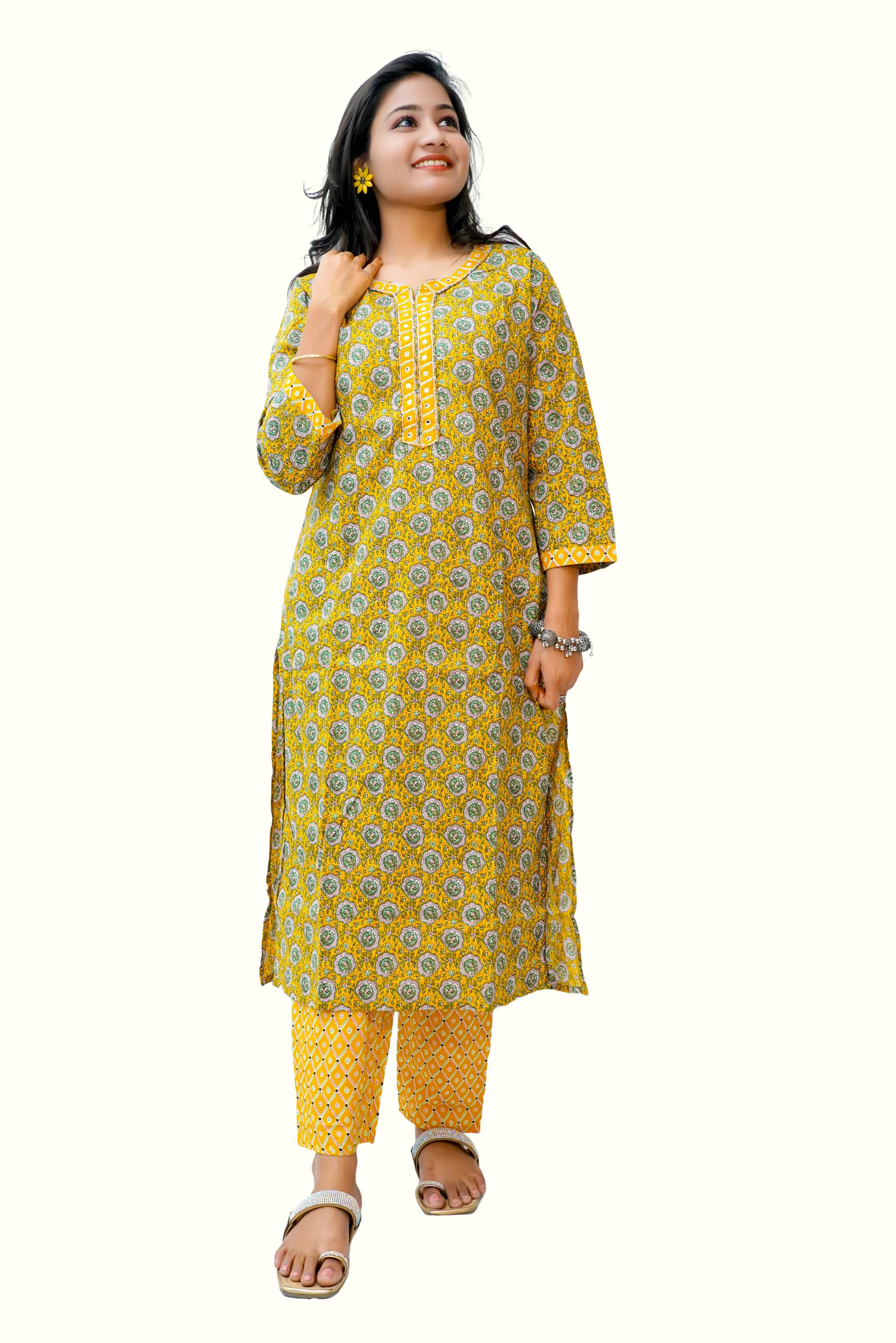 Fabric: Cotton Sleeve Length: Three-Quarter Sleeves Pattern: Printed Combo of: Single Sizes: XL, L, M, XXXL, XXL "Introducing our exclusive Mustard Cotton Kurta Set with Dupatta – a true embodiment of elegance and opulence. This unique ensemble, available in a range of sizes from M (38) to 3XL (46), is meticulously crafted to provide a luxurious and comfortable fit for every body type. The rich Mustard hue exudes sophistication, making it the perfect choice for those seeking an elegant party wear look. The intricate and beautiful work on the kurta set sets it apart, showcasing a level of craftsmanship and quality that is truly unparalleled. The richness and quality of this ensemble are unparalleled, making it a statement piece for any special occasion. With every stitch, it reflects a dedication to creating something extraordinary. The Mustard Cotton Kurta Set is not just clothing; it's a work of art that you won't find anywhere else. Draped in this ensemble, you'll be adorned in elegance and style. Whether it's a festive celebration or a special event, be prepared to turn heads and leave a lasting impression. Experience the beauty of Mustard, the allure of intricate work, and the richness of quality – all encapsulated in our Mustard Cotton Kurta Set with Dupatta. Elevate your wardrobe with a piece that is as unique and exceptional as you are." Country of Origin: India
