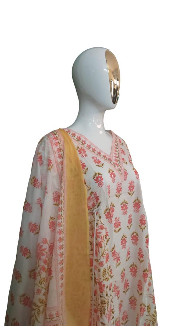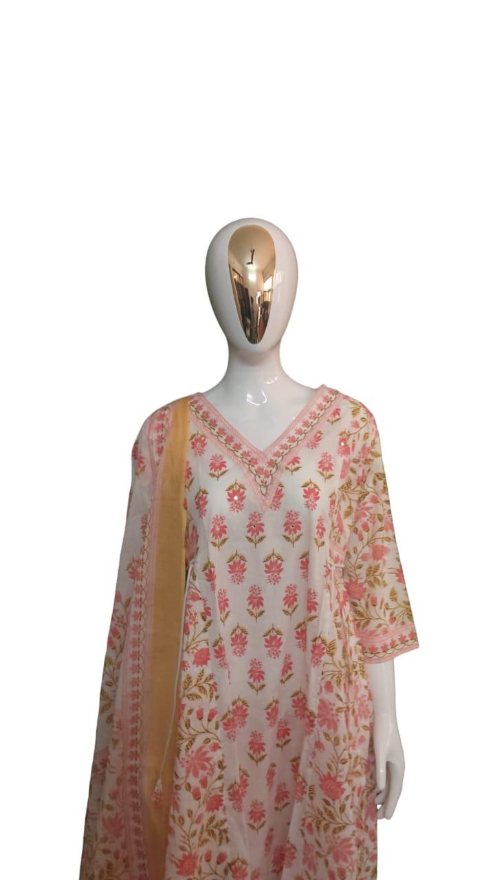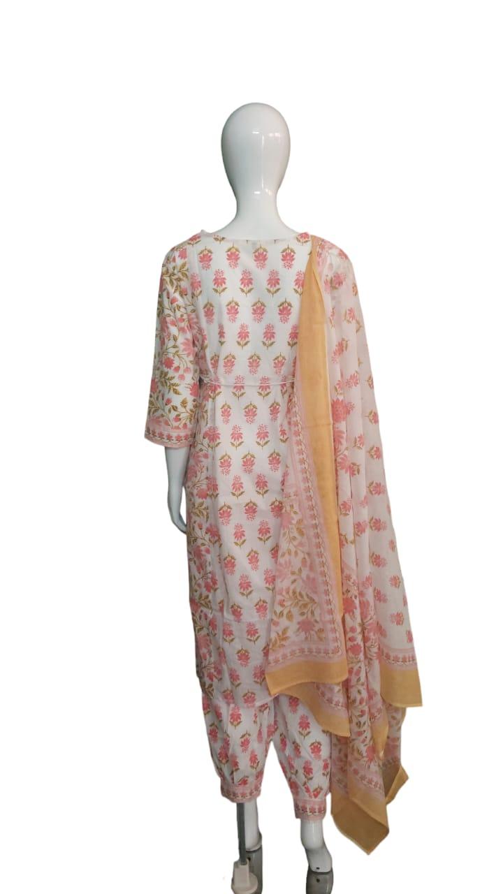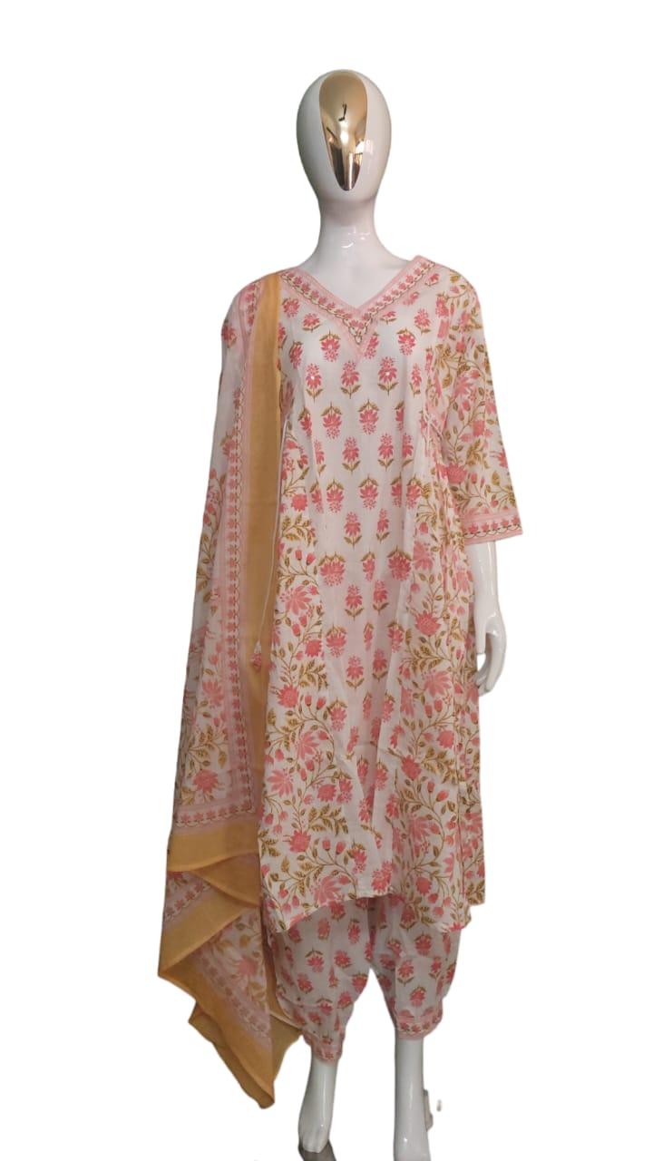 Kurta Fabric: Cotton Bottomwear Fabric: Cotton Fabric: Cotton Sleeve Length: Three-Quarter Sleeves Set Type: Kurta With Dupatta And Bottomwear Bottom Type: Pa