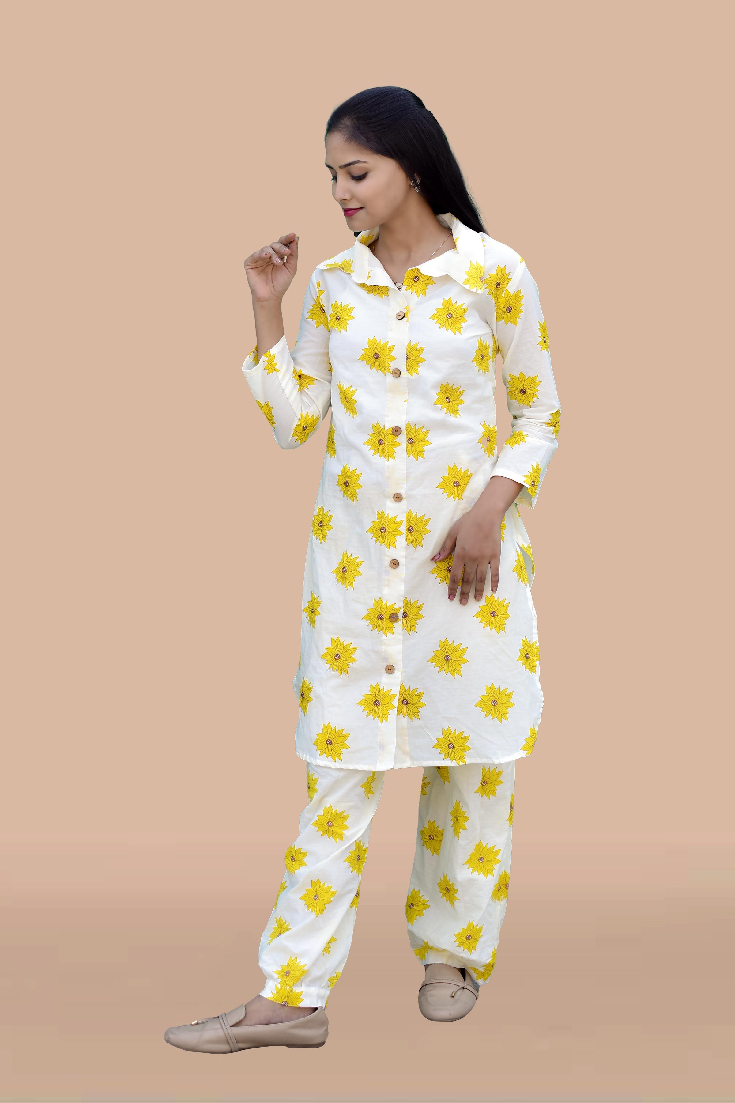 •Print: The kurta features a charming sunflower print, adding a touch of nature-inspired beauty to the outfit.
