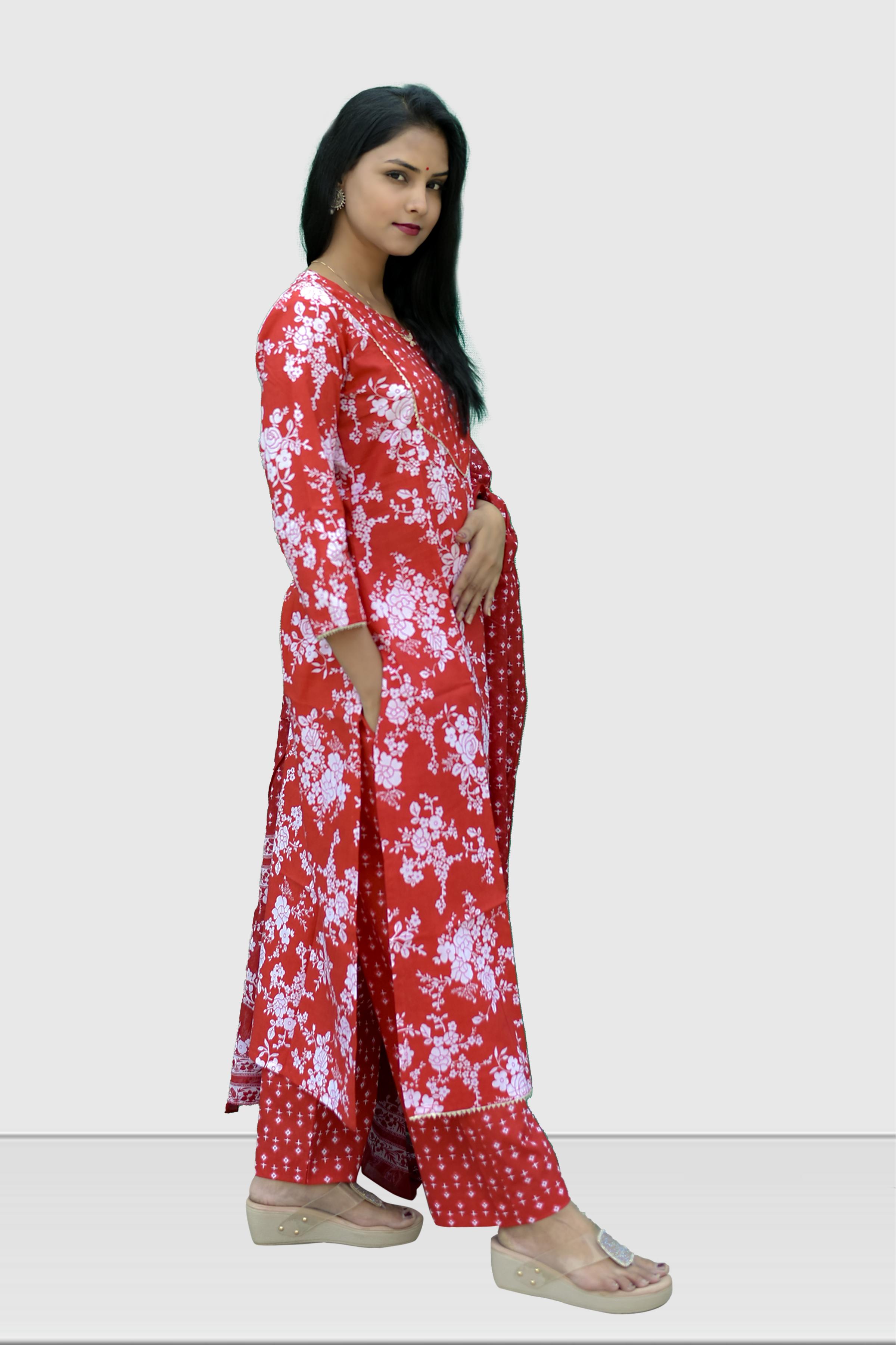 •Color: A Red Printed Cotton Kurta set with a dupatta is a timeless and elegant choice that offers comfort, style, and versatility for various occasions.