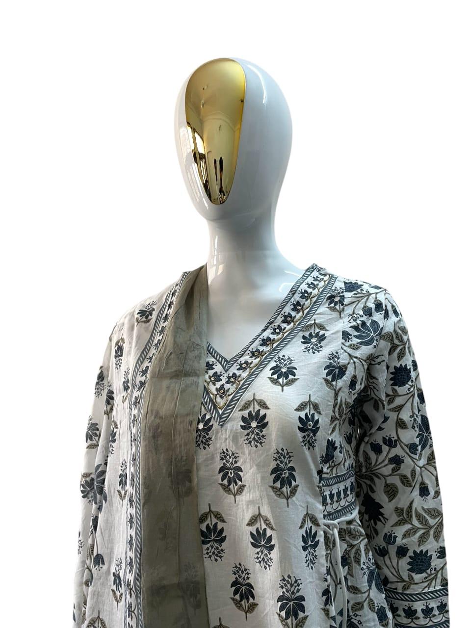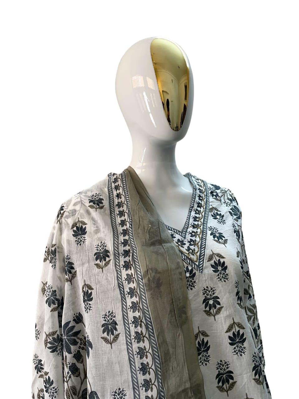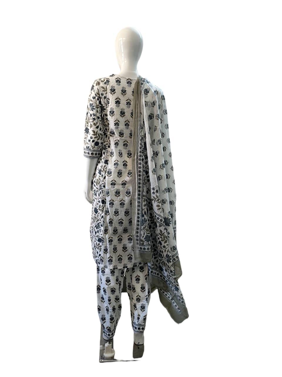 Kurta Fabric: Cotton Bottomwear Fabric: Cotton Fabric: Cotton Sleeve Length: Three-Quarter Sleeves Set Type: Kurta With Dupatta And Bottomwear Bottom Type: Pants